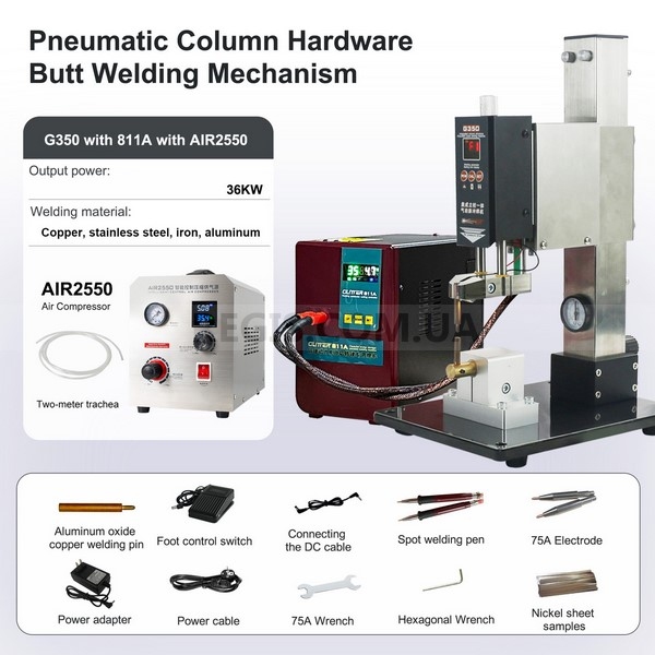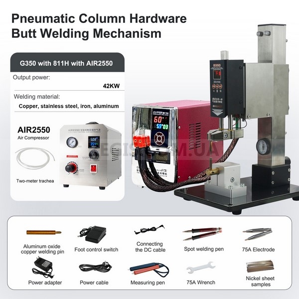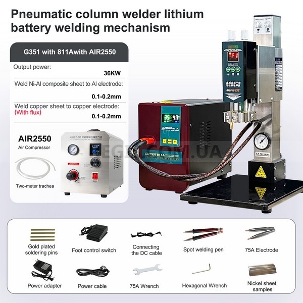 SUNKKO AIR 2550 - безмасляний портативний компресор із розумною системою керування. Підтримує стабільний тиск, має цифровий дисплей, працює тихо (50 дБ) і забезпечує чисте стиснене повітря без домішок масла. Підходить для точкового та контактного зварювання, роботи з пневмоінструментами, фарбування та лабораторних завдань. Регульований тиск до 0,6 МПа, продуктивність 213 л/хв, ефективне охолодження, компактні габарити та вага 12,5 кг. Використовується в парі з стойками GLITTER G351, G350.